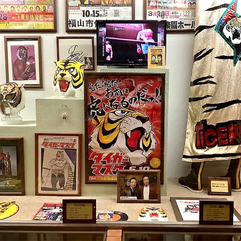 プロレスミュージアム 初代タイガーマスクの使用していたガウン、ジャイアント馬場のリングシューズ、力道山の昭和33年優勝カップ、各種トロフーなどプロレス関連グッズを展示。昭和51年に行われた、アントニオ猪木×モハメド・アリ世紀の一戦の映像も流れます。往年の名勝負が蘇ります。